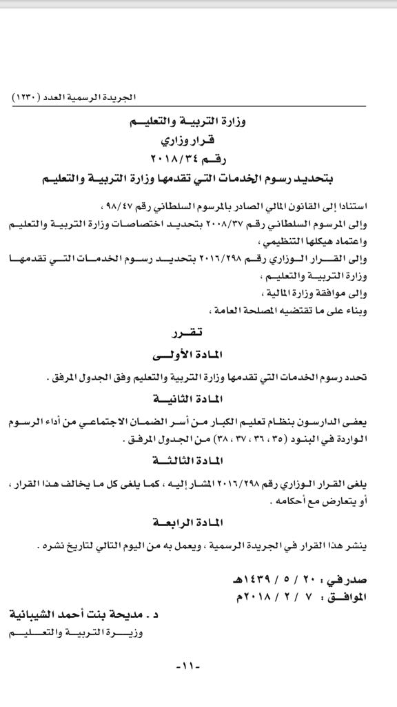 قرار وزاري 34/2018 بتحديد رسوم الخدمات التي تقدمها وزارة التربية والتعليم، وقد جاء في القرار الذي اعتمدته معالي د. مديحة بنت أحمد الشيبانية وزيرة التربية والتعليم تحديثا لقائمة الرسوم التي تقدمها الوزارة لمختلف خدماتها التي تخص مدارس التعليم الخاصة والخدمات المختلفة التي تقدمها عبر مؤسساتها ومدارسها الحكومية.